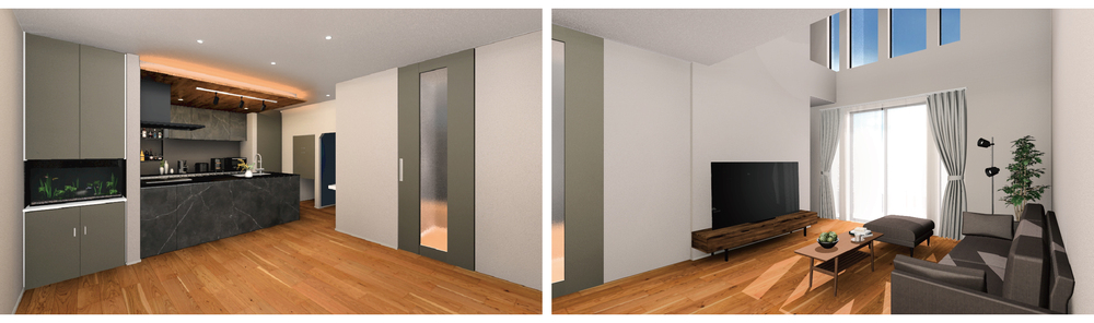 LDKは、南側に吹抜けリビングと大きな窓を設け、明るい室内空間が広がります。