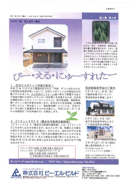 2011/02/10 イベント情報 びー・える・にゅーすれたー 2月号 びー・える・にゅーすれたー 2月号!完成現場見学会 開催情報を先行告知しております。ぜひご一読ください。よろしくお願いします。 びー・える・にゅーすれたー 2月号 お問い合わせは、下記のフォームからどうぞ。 必須お名前 必須E-Mail 必須ご住所 必須電話 (携帯電話可) FAX ご希望の連絡方法 電話 FAX 郵送 E-mail その他(下に記入して下さい) 連絡事項 送信確認